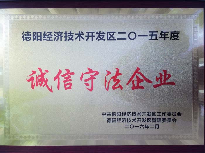 ?2016年2月29日,我公司參加德陽經(jīng)開區(qū)2016年黨建工作和社會事務(wù)工作會議。會議對2015年度黨建、社會事務(wù)、深化改革、依法治理工作先進單位和先進工作者進行表彰。我公司榮獲德陽經(jīng)濟技術(shù)開發(fā)區(qū)“2015年度誠信守法企業(yè)”稱號。